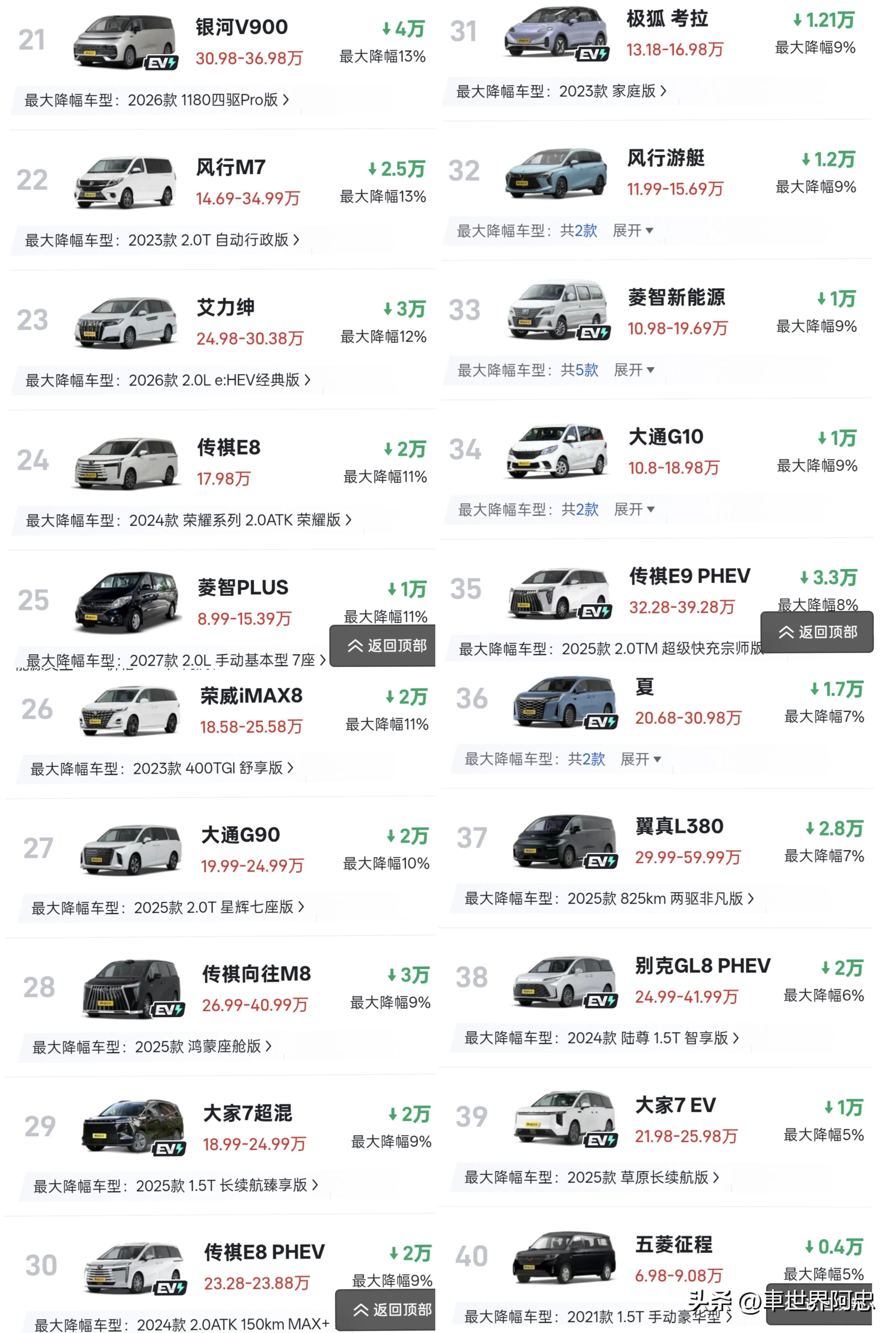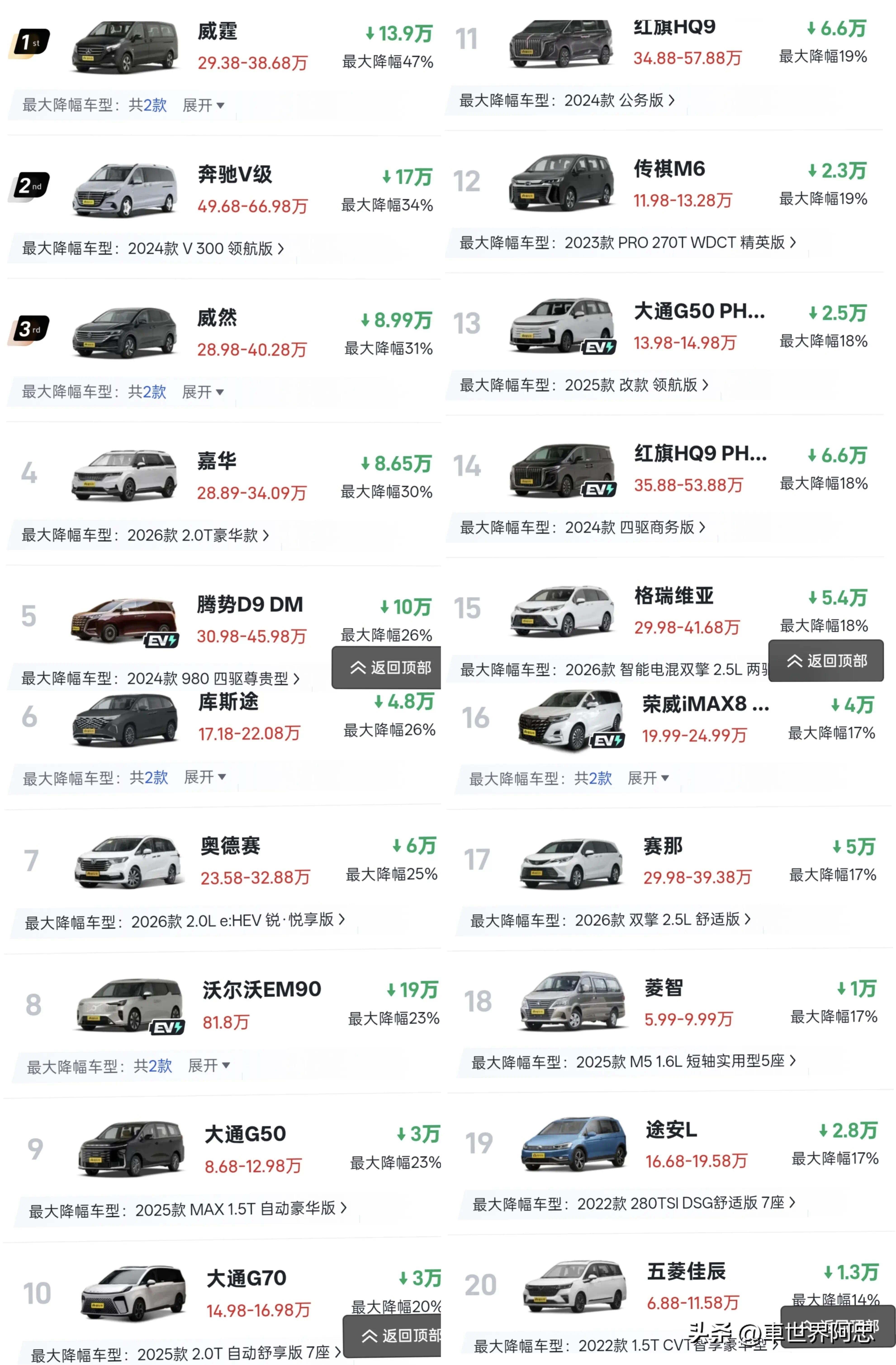 导读:五一假期临近,除了出游热情高涨以外,MPV市场的“价格战”也在悄然升温。多家车企为了抢占假期购车黄金窗口,纷纷提前推出了大幅度优惠促销活动。这一波降价对于部分计划趁着五一小长假带全家出游的消费者来说,正是入手MPV的好时机。那么、目前MPV市场各车型都有怎样的优惠力度呢?让我们一起来看看最新出炉的MPV降价排行榜吧?从榜单数据来看,合资品牌在本次降价促销活动中,优惠幅度最为惊人,部分车型最高让利达到了47%,几乎腰斩。而国产品牌这边也有不少热门车型参与其中,比如腾势D9DM,大通G50、大通G70等车型起售价都下调了20%以上。红旗HQ9、银河V900、传祺E8等车型也都集体跟上,新车价格也都出现较大幅度的回调。真的惨!MPV市场迎来大降价:最高降幅达47%,合资车带头“跳水”